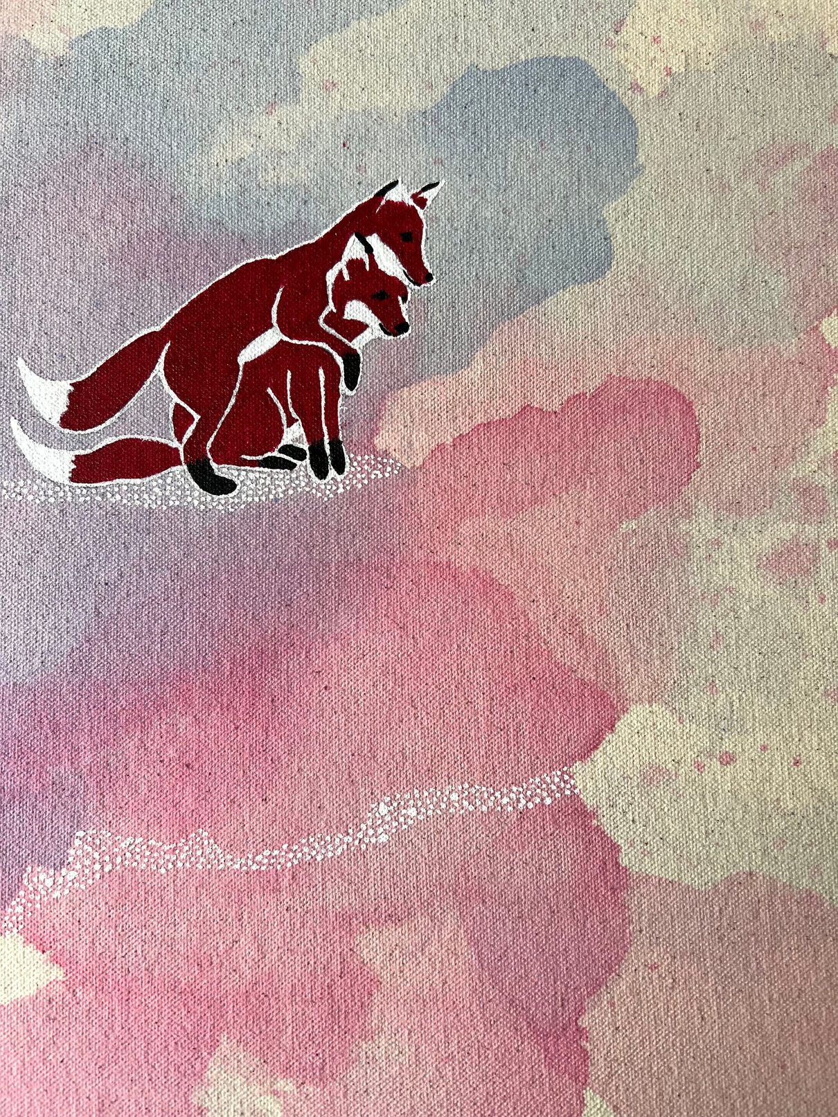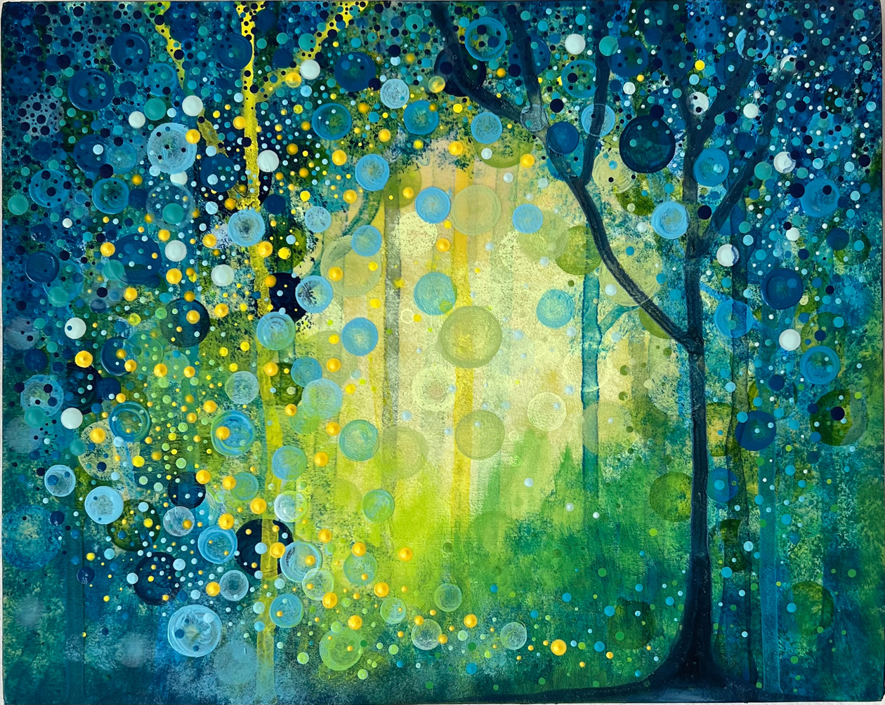 Her current work is a lighthearted exploration of movement, whimsy, and wonder. Her current medium acrylic on natural canvas taking form though a mix of abstract and nature inspired elements.